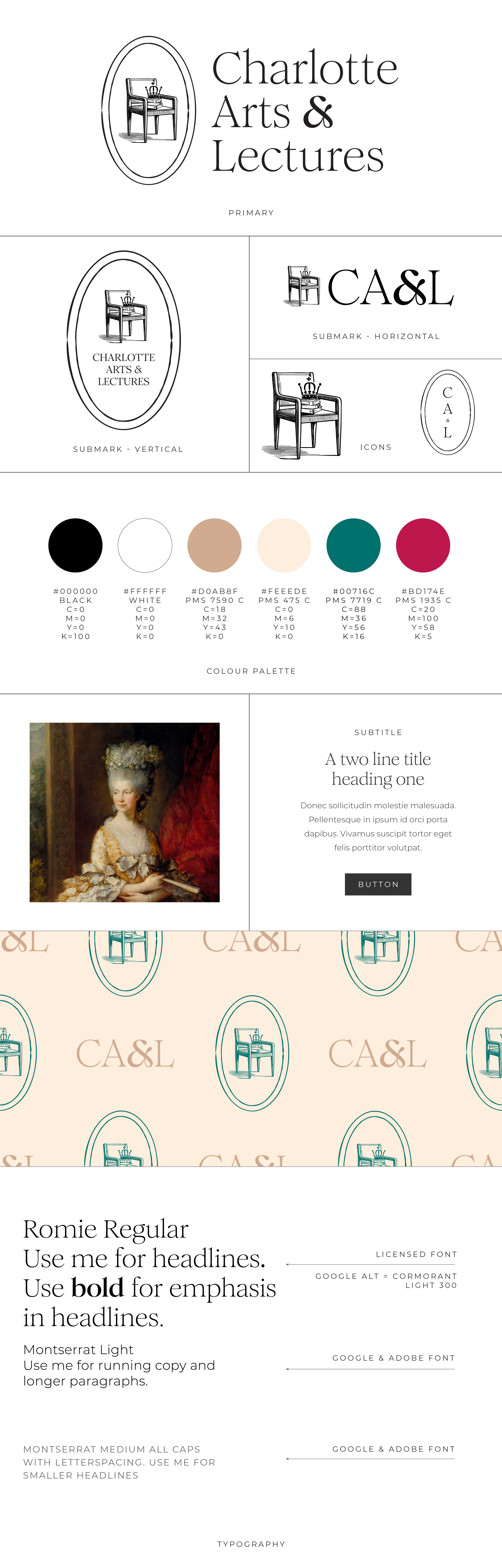 I developed a logo for Charlotte Arts and Lectures using elegant typography and crown iconography to tie into Charlotte’s nickname, the Queen City. The client wanted the logo to feel aspirational and cultural, while remaining versatile for use across event materials and in single-color applications.